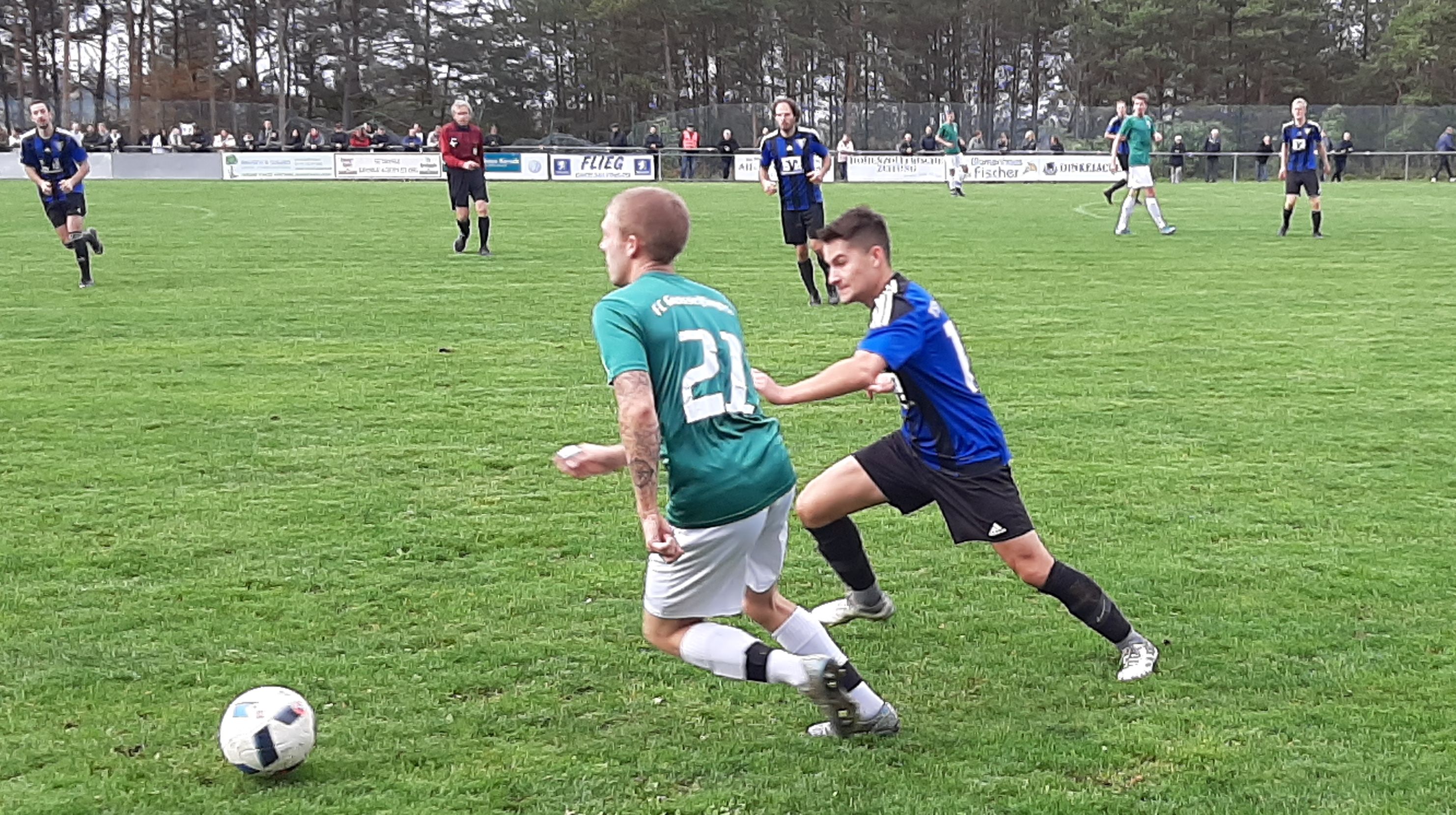 Eine in allen Belangen bittere Niederlage musste unser Team am Sonntag in Grosselfingen hinnehmen. Das Verfolgerduell begann flott und beide Teams spielten nach vorne. Nach einem unnötigen Foul auf der rechten Seite trat M. Pflumm (5´) den Freistoß scharf in den Sechzehner. Vorbei an Freund und Feind landete der Ball im langen Eck und die Heimmannschaft führte mit 1:0. Unsere Mannschaft versuchte spielerisch in Richtung Gästetor zu gelangen, jedoch blieb der Ball in der vielbeinigen Abwehr hängen. In der zwölften Minute war es dann Spielertrainer F. Pflumm, der nach einem schon sicher geglaubten Ball das 2:0 in den Winkel hämmerte. Die Geislinger Kicker versuchten nun das Mittelfeld schnell zu überbrücken, waren jedoch im Abschluss nicht zwingend. Erst kurz vor der Pause war Jens Kinnemann (42´) erfolgreich. Nach einer schönen Flanke von Paolo Cucca in den Strafraum konnte Jens den Anschlusstreffer erzielen. Bei dieser Aktion verletzte sich der Gästetorwart schwer am Knie und musste ausgewechselt werden. Von dieser Seite aus „Gute Besserung“. Nun hatte Geislingen wieder Luft geschnuppert und im Anschluss an einen Eckball köpfte Andi Bühler aufs Tor, aber der Schlussmann zeigte eine Glanzparade und verhinderte den Ausgleich. So ging es mit knappem Rückstand in die Kabine. Nach dem Seitenwechsel folgte dann der nächste Nackenschlag. In der 47. Minute war es erneut F. Pflumm der mit einem sehenswerten Heber das 3:1 erzielte. Als dann in der 50. Minute ein Geislinger die rote Karte sah, war das Spiel entschieden. Die Heimmannschaft spielte nun überwiegend lange Bälle auf die schnellen Stürmer und brachten die Jungs von Trainer Gallinaro ein ums andere Mal in Schwierigkeiten. Einen letzten Konter in der 86. Minute schloss dann L. Schwabenthan zum 4:1 Endstand ab.